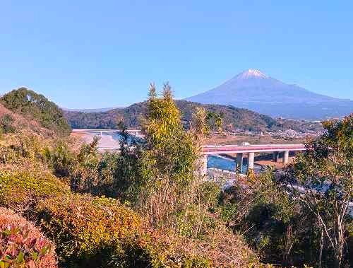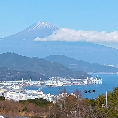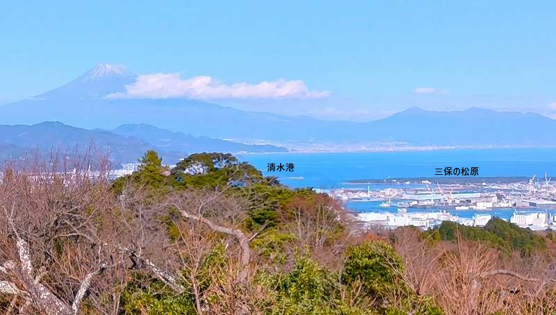 標高約300mの丘陵地で、駿河湾越しに仰ぎ見る富士山、眼下に見える清水港、伊豆半島、南アルプスのパノラマビューは、