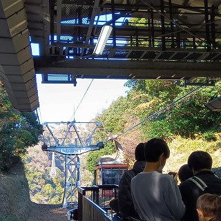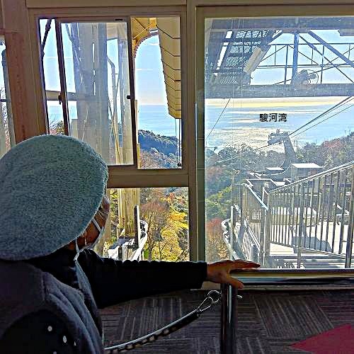 1時間位並んで、ロープウエーで久能山まで下ります。 駿河湾に白いイチゴハウスが連なっている。