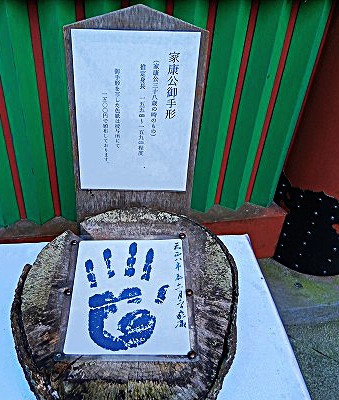 社務所で拝観料を払い楼門をくぐると、家康38才の意外と小さい手形があった。