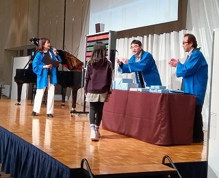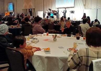 食事中にオペラ歌手登場、最後のビンゴゲームでビンゴ(宿泊券2名)に輝いた孫(ブルー目で缶バッジ当てた運続き)本人も揃うと始まる前に言っていた通りになりました。