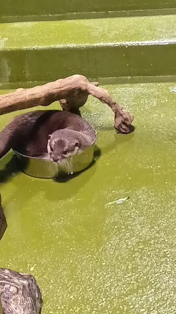 ![]() 野生は狂暴なり・・・かわいいカワウソも狂暴だが(餌やりで芸を仕込み中)飼いならしていました。 2匹いました。 |