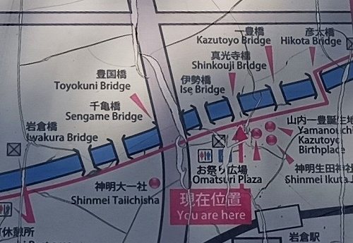 ![]() 1554年(天文23)に山内但馬守盛豊により岩倉城内に勧請されましたが、1559年(永禄2)織田信長に攻められ岩倉城は落城します 境内を通って五条川へ |