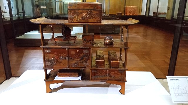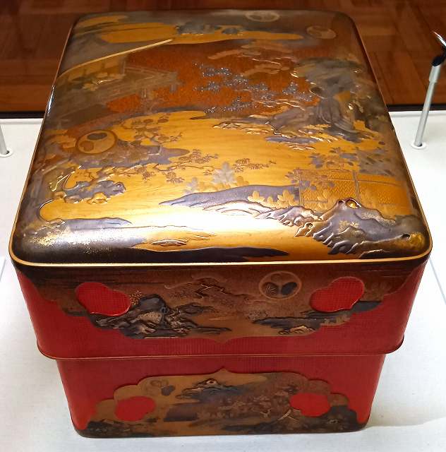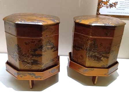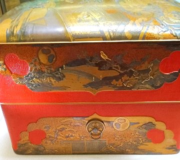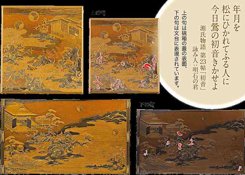 ![]() ![]() 『初音の調度』には当代最高峰の蒔絵技術がさまざまに駆使されている。 江戸時代の上流階級では娘にまず「初音」の巻から『源氏物語』を学ばせた事に由来する。 |