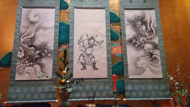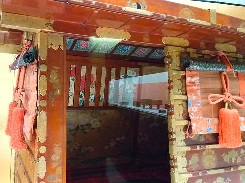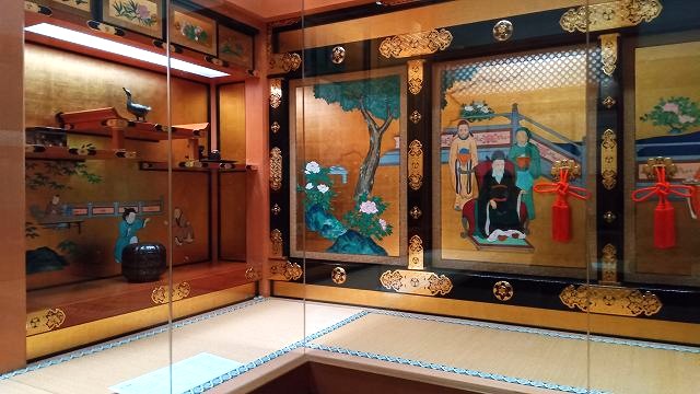 ![]() 展示物は武具・刀剣>茶の湯>書院飾り>能>初音の調度へとすすむ |