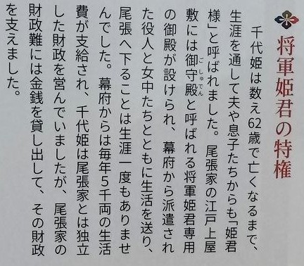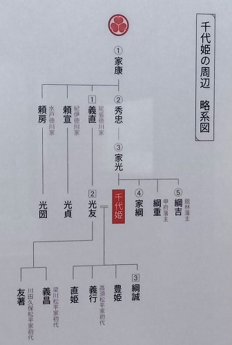 ![]() 千代姫(1637~98)は、3代将軍徳川家光の第一子として江戸城に誕生した、生まれながらの将軍姫君です。当初、男子に恵まれなかった家光の後継ぎを確保するため、 わずか2歳6か月で尾張徳川家2代光友に嫁ぎました。その後に誕生した弟の家綱と綱吉、2代にわたる将軍の姉として権勢をふるった千代姫の生涯は華麗の一言に尽きます。 |
