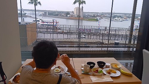 ![]() 昨日の疲れか、ぐっすり眠れた。 雨を眺めながらの朝食、ホテルの桟橋から万博会場まで船が出ていました。 |