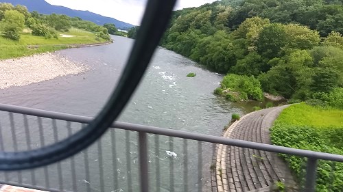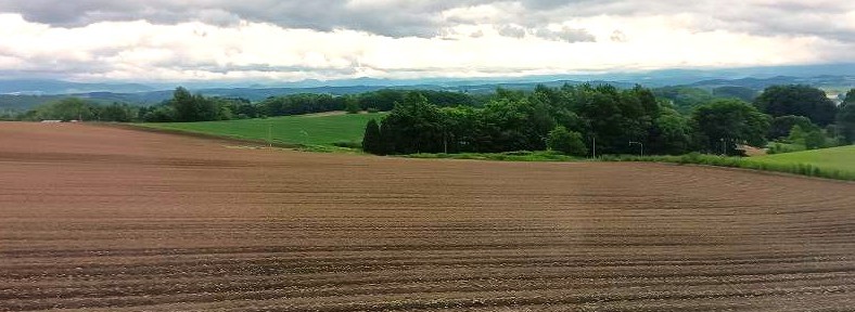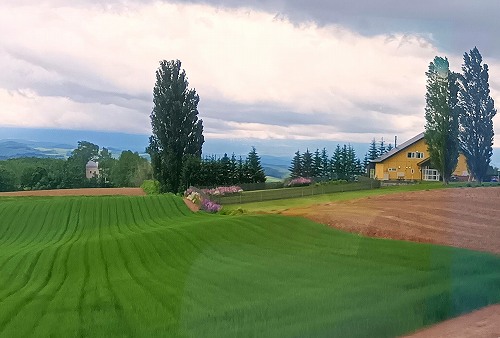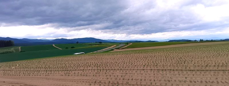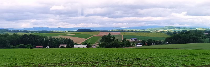 ![]() パッチワークの景色は車窓から 区画ごとに複数の農作物の作付けを行うことで、カラフルな景色を織りなすことから「パッチワークの路」 |