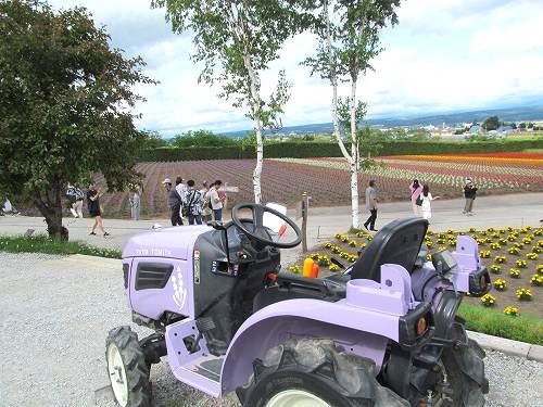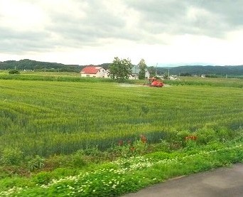 ![]() 美瑛パッチワークの路を離れてファーム富田へ走ります 麦畑を消毒中?水やり中? |