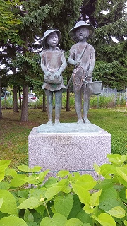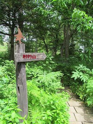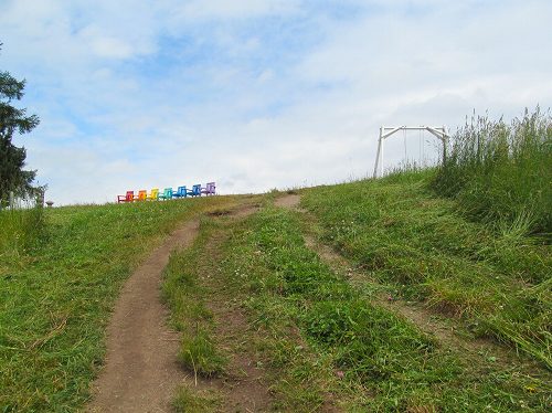 「射的山」 屯田兵が射的訓練に利用した丘。 石器なども出土した遺跡でもあります。 川上盆地の田園風景を見下ろす空のブランコと虹の椅子