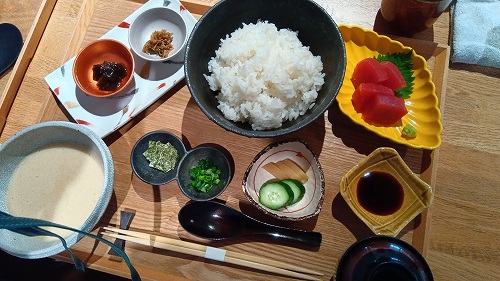 私は とろろ膳殿が食べた ⇑ 笠庵特製出汁茶漬け御膳、具材7種盛り合わせ、伊勢真鯛のごまだれ和え、本日の焼き魚、ご飯、香の物、お出汁 |
