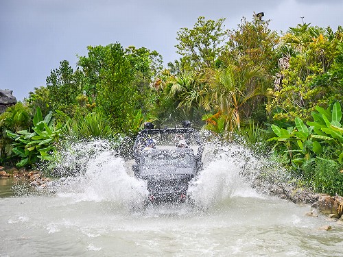 ![]() 12人乗りの大型オフロード車に乗り込み、恐竜が生息するジャングルを探検するアトラクションです。 私達はドライバーの後ろに前向き2人、ここに乗り込み最高でした。10人は5人づつ横向きの向かい合わせで背中が見えない。 |