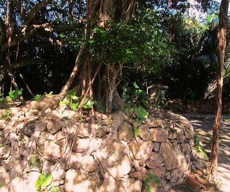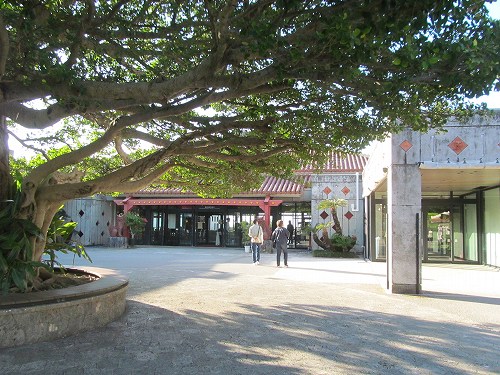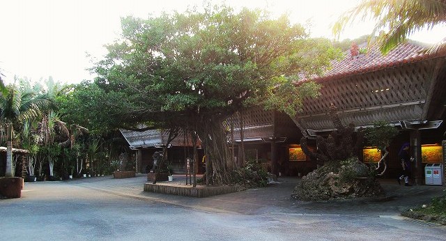 ![]() 土産物屋を抜けたところが琉球村の入り口です。 大きなガジュマルの木がそびえて居ました。 ガジュマルは水の中だと思っていました。 |
