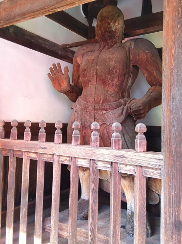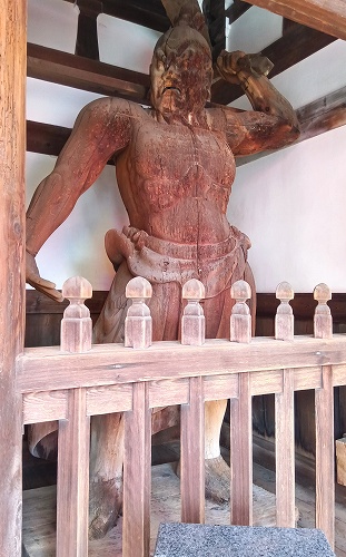 向かって右方が口を開いた『阿形(あぎょう)』です。仁王門の建築年代は、天井裏から発見された板札に慶長12年(1607)の日付があり、記録や様式からもこの年代と見られるそうですが、