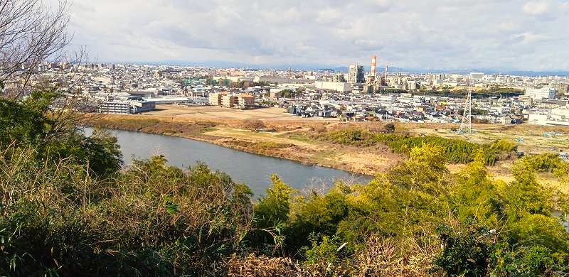 展望台から庄内川と奥に見える春日井王子製紙の赤白の煙突