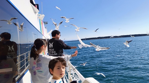 ![]() カモメのえさを買い、手の平に乗せると・・・怖がって食べる寸前に手を引いてばかり・・・カモメのふんが当たる寸前で窓にべたり! |