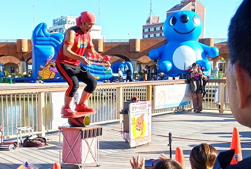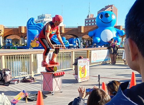 ![]() 大道芸人の技、5個の球を受け止める・・・なかなか決まりません・・・決まるまでお金(寸志)がもらえません |