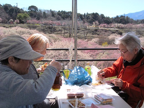 ![]() 道の駅「ふれあいパーク」で買った弁当を梅の花を見ながら広げる(日陰は少し寒いです) |