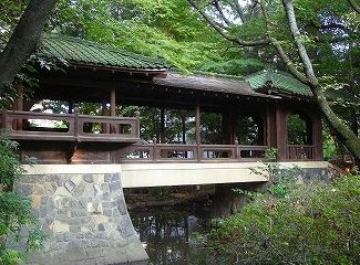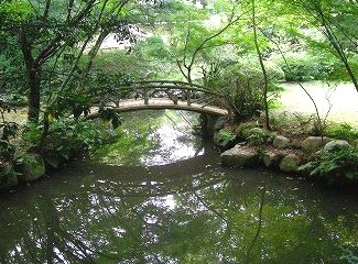 ![]() 庭園は、池を中心とした回遊式の庭園で、修学院離宮の千歳橋を模したといわれる白雲橋 |