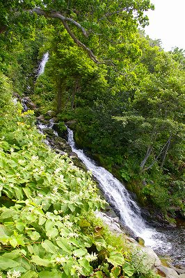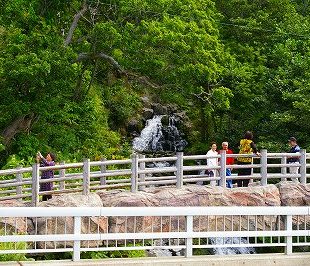 ![]() 途中から流れが2つに分かれ「双美の滝」とも呼ばれるダイナミックな滝 落差50M |