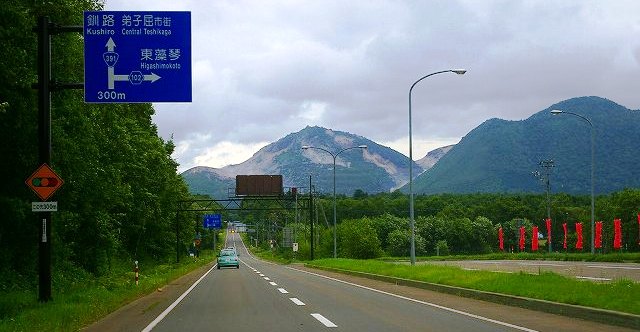 ![]() 見て見てここも真っ直ぐな道路・・・・正面に硫黄岳の噴煙 |