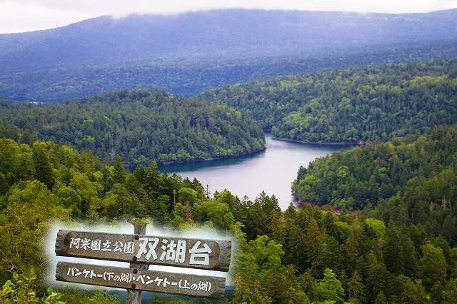 ![]() 国道241号脇の双湖台からの、神秘的な樹海の中に静かにたたずむ2つの湖を発見 手前に見えるのがペンケトーで北海道の形に似てる?奧がパンケトーでこちらの方が大きい。 |