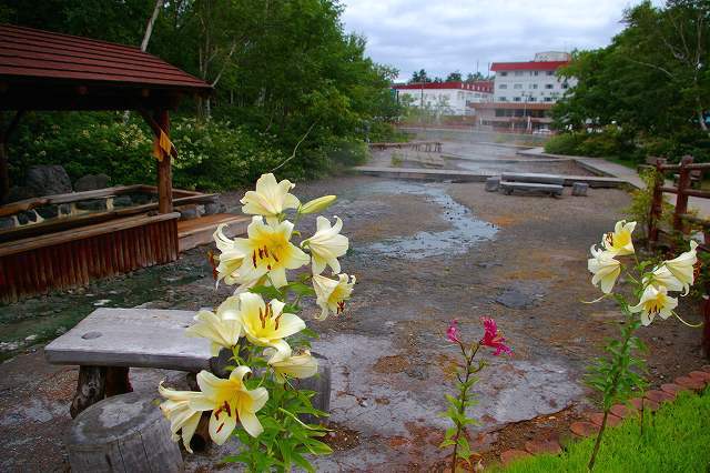 ![]() 足湯から流れ出た湯の川が、湯煙を上げ川湯温泉の雰囲気を演出。 |