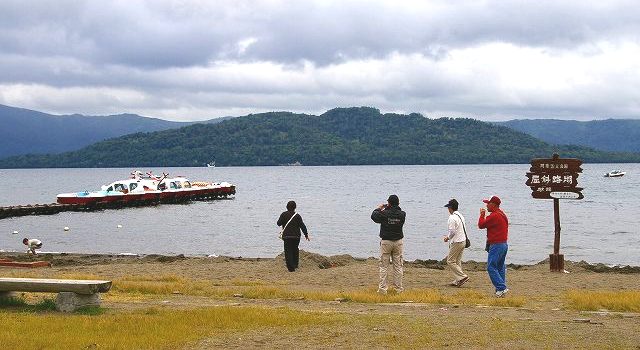 ![]() 屈斜路湖(カルデラ湖で日本最大) 正面の島が湖中島である中島(高さ355m周囲12km)が浮かぶ。 |