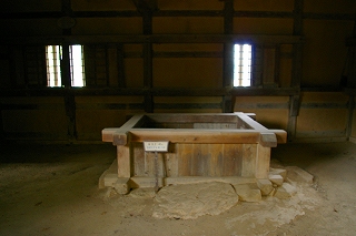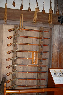 ![]() 天守閣は直径1m近い2本の柱で支える。東大柱は昭和の大修理で地下部分だけ取り替え、築城当時のまま残る。 鉄砲は火縄銃・火薬を入れる袋がぶら下がり・・スタンバイされてます! |