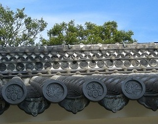![]() 左:腰曲線の多門長屋の「塩櫓」で中には井戸もあり、籠城に備えていた。 右:城主の紋瓦と修理した城主の家紋 |