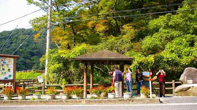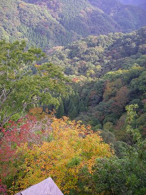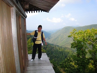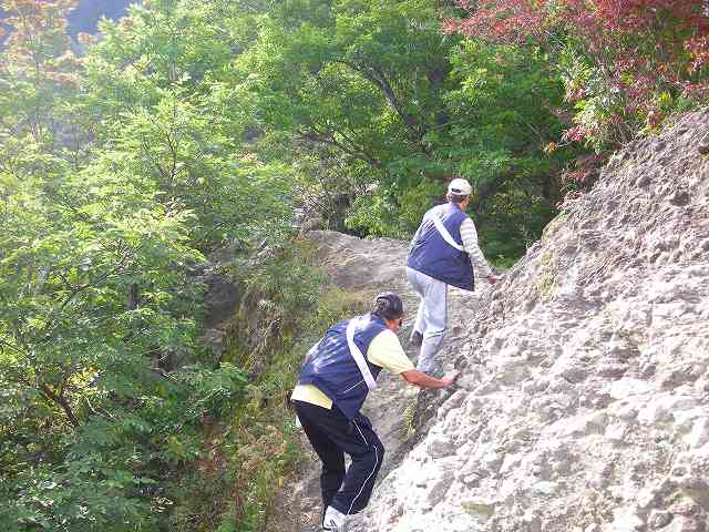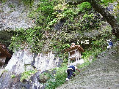 不動堂には 登らんとね〜横から撮ると言って危険な崖をよじ登る二人(即レッドカードです)。私は足がすくんで、途中で断念(イエローカード) 降る時が恐くて登りの格好で降りたら、Yukuoさんは逆向きで動物のように中腰で、つまずいたら谷底なのにクワバラ々。 |