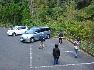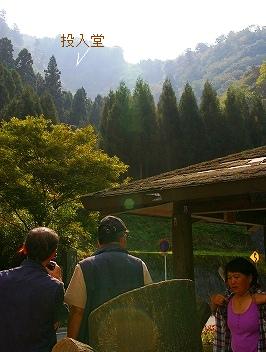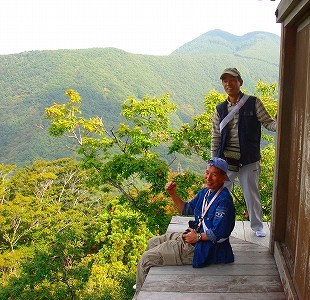 ![]() 「投入堂遥拝所」 登らなかった女性3人に備え付けの望遠鏡で見てもらう |