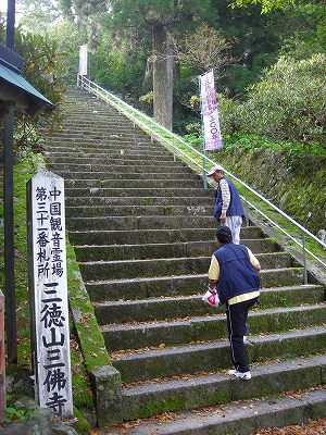 ![]() 9:00 三佛寺入山料を払い、1回目の靴の検査を受ける。 ←いきなり急階段に気を引き締める。 だんだん息が上がる? |