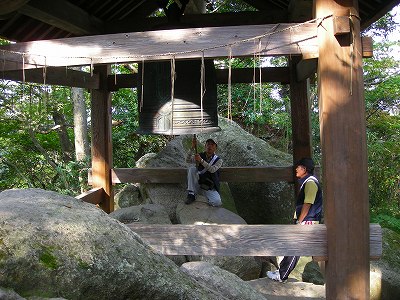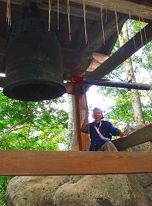 ![]() 「鐘つき堂」 鐘の大きさは、約1.15m、重さは約3tもある。 「鐘楼堂」の「鐘」はどうやって運び上げたんだろう? 「ゴォ〜ン」と三徳山に鳴り響く |