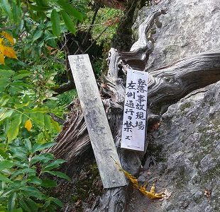 ![]() 右側の絶壁を見てちょう!大岩の裾の足場は斜めで30Cm幅を、恐る恐る横切る難所。 |