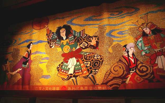 ![]() 浄瑠璃と渦潮がみごとな大だん幕*1体の人形を3人(足7年・左手7年・頭と右手は一生)で操る。 |