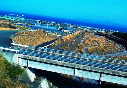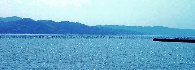 ![]() のり養殖の竹竿が続く有明海!バスは熊本港へ走る。 |