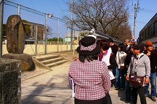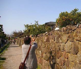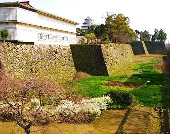 ![]() 島原第一小学校前の「県立島原商業学校跡地」石碑の文字は金ピカ(お墓の文字も金ピカ) 島原城と堀(辛夷と雪柳が満開)*バスは路駐で待つ |
