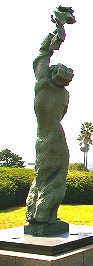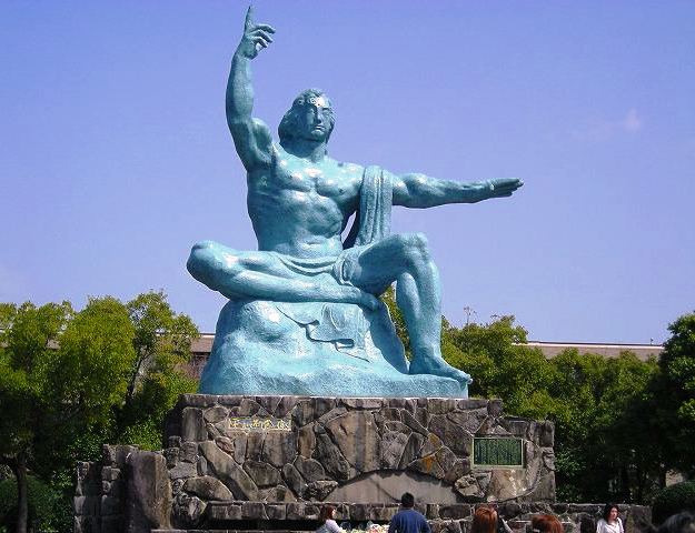 ![]() 平和記念像:高さ9.7m重さ30t (塗り直して間もないそうです) 右手は原爆の脅威を、左手は平和を示す。閉じた目は犠牲者の冥福を祈る。 |