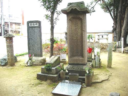 ![]() 切支丹塚(右)。火災には免れたが地震で折れた跡がのこり、 左奥には顕彰碑が、切支丹の受難と寺のあらましが刻まれる。 |