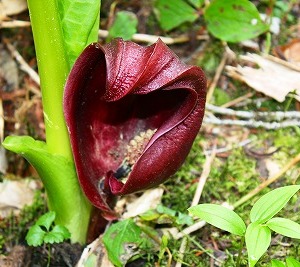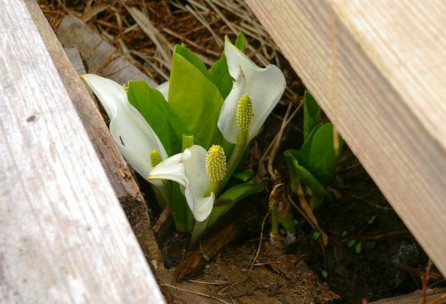 栂の大門駅か栂の森駅の近くから散策路を歩く*こじんまりした水芭蕉園*葉が巨大で恐竜でも出そうだ! |