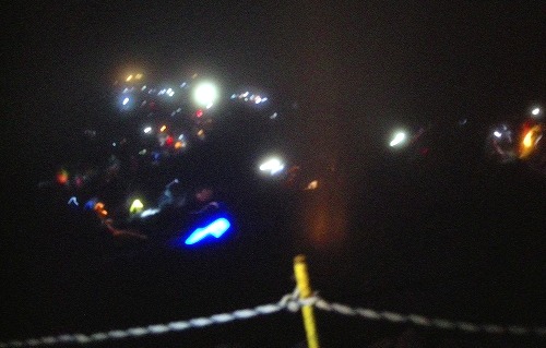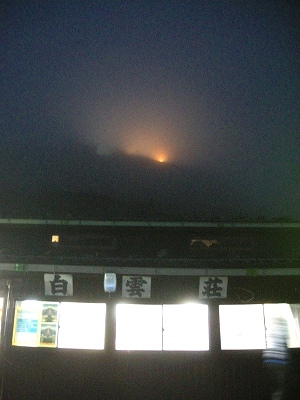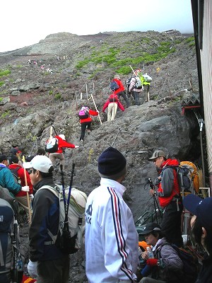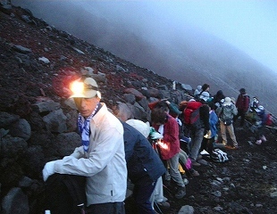 Pm9:00〜Am1:30まで仮眠だが、胃のムカつきに寝付けず、 1時にトイレで嘔吐し、ご来光は断念しかけたが、気分が良くなり登頂することに決定。 ![]() Am2:20山小屋を立つ(要らない荷物は小屋に置いて出発)空身に近いので非常に楽である。 どんどん上がってくるので渋滞がおきて、80分で登れるのが2時間かかる(私には丁度良い) |