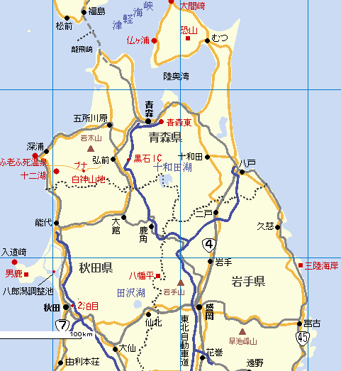 ![]() 十二湖から秋田の宿まで日本海を120kひた走り(男鹿半島は次の機会) |