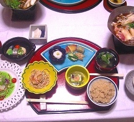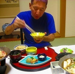 ![]() 個室(遅れたからかな)の食事で、秋田名物「きりたんぽ」等おいしくいただく。 |
