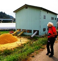 ![]() コンバインで稲刈り>藁は刻まれて落として行く 稲刈り後の残り藁を圧縮して ホースから次々と モミガラの山 |