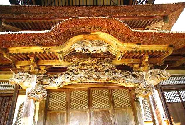 ![]() 唐破風向拝に施された雲蝶作の彫刻は年代を感じさせる色合い・・・ |