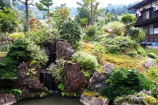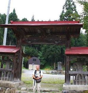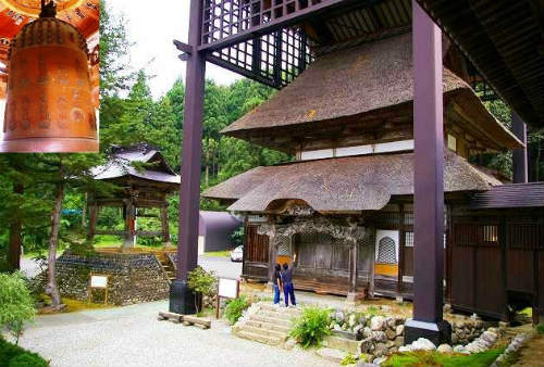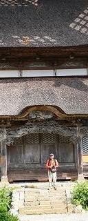 ![]() 平成11年・雪から茅葺の御堂を守るための覆い屋根を造る。 本堂*入山料(¥300) |