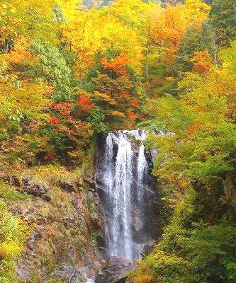![]() 白水(しらみず)の滝 落差72m 駐車場から下って5分 標高1,140mの原生林から流れ落ちる滝は水の色が乳白色に見えると |