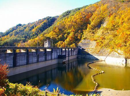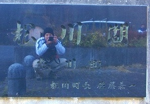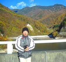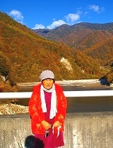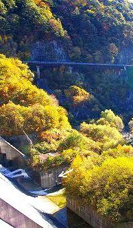 ![]() 猿のつり橋が架けてあるのに驚く(矢印) 右岸から撮影。 松川湖*紅葉がとても綺麗でしたが寒い寒い |