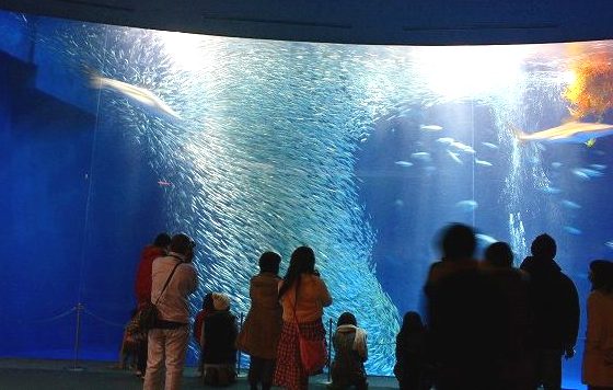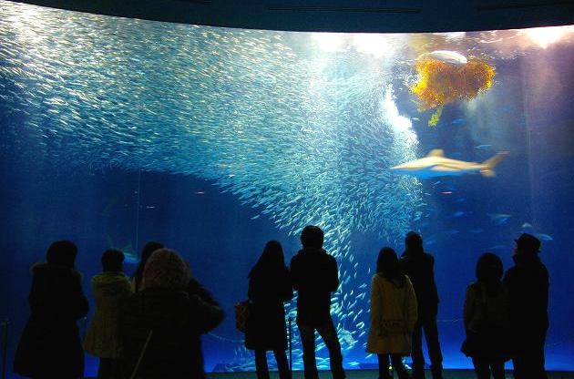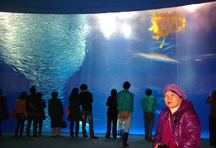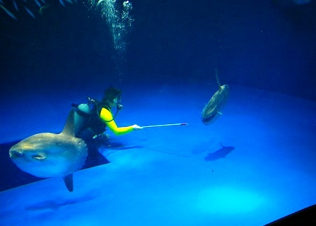 ![]() 新しく入ったマンボウ二匹に餌をやっているところ |