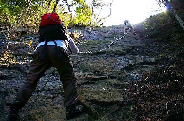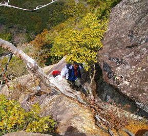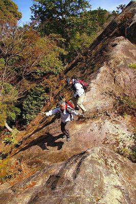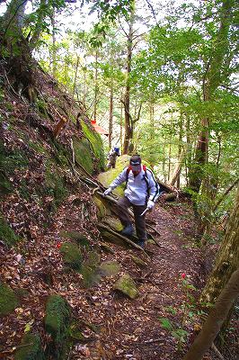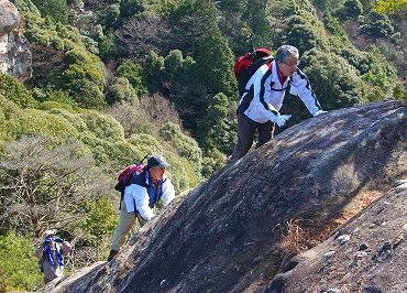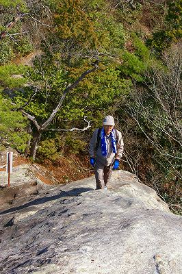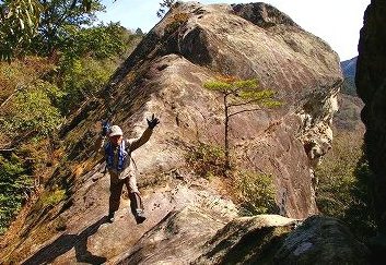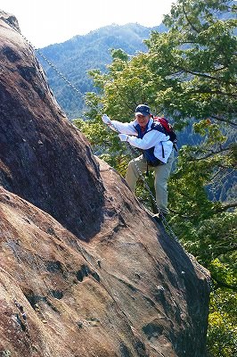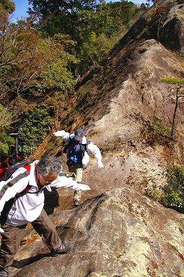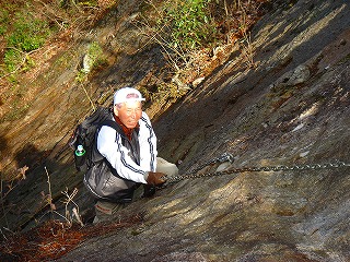 ![]() 「飛び石」登り↑岩山にも慣れてきて余裕の笑顔が出てきた(気は引き締めている) |